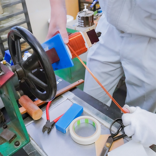 特殊な用途に使われるカスタム製品。ときには一品ものとなる少量生産品に他者にない価値を与えるのは、当社の社員ひとりひとりの手に宿るクラフトマンシップです。機械巻きでは再現できない手巻きコイル、一分の妥協もない自社設計のボビン、素材の相性までこだわり抜いた樹脂モールド──。